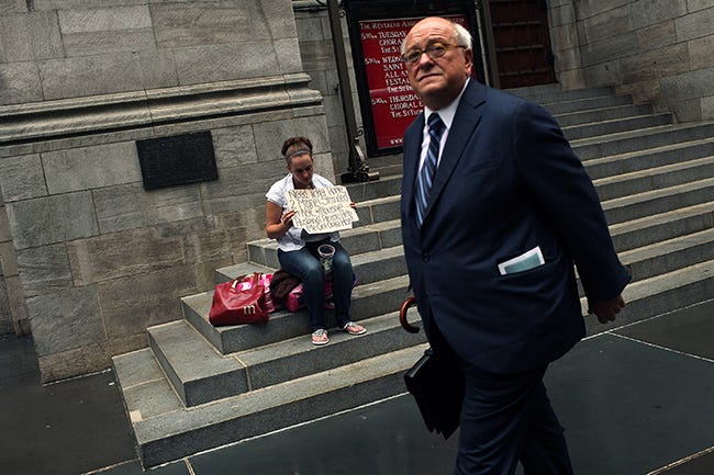 Figure 2 is a relatively common theme of the business person, rich individual, turning away from the person holding up a sign indicating help is required. Interestingly, both subjects are white in this image but gender is present.